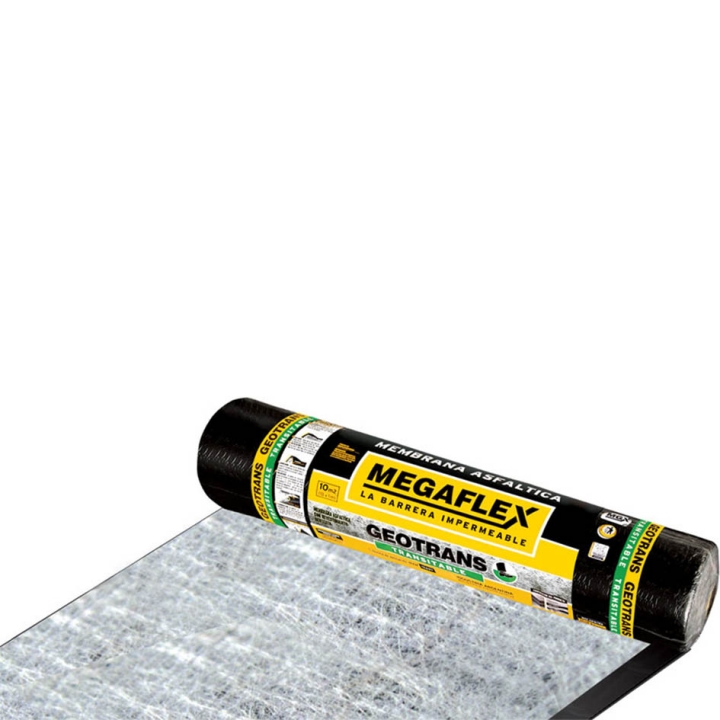 Membrana elaborada con Asfalto Plástico Megaflex, con revestimiento de Geotextil (Poliéster) de hilo continuo, formando un tejido entramado al azar en todas direcciones, llamado tejido no tejido; y con resinas que aumentan sus propiedades de adhesión a la