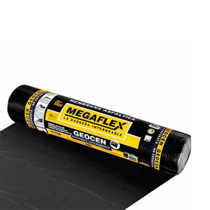 Membrana de Asfalto Plástico Megaflex con armadura central de Geotextil (poliéster) que mejora las propiedades mecánicas logrando mayor resistencia a los esfuerzos de punzonado y posibles desgarros que pueden producirse sobre la membrana. Con cobertura su